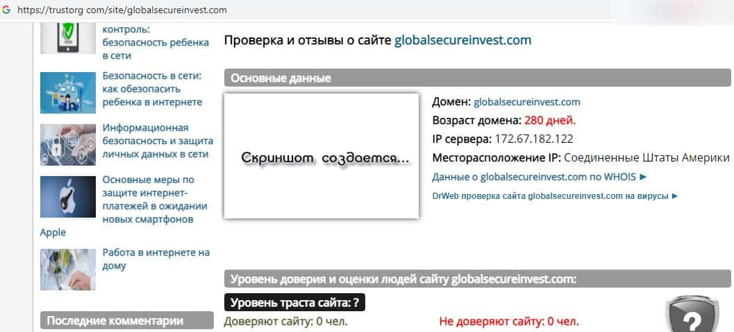 Согласно сведениям с уважаемого интернет-портала трусторг кам, возраст домена шарлатанского фонда Глобал Секьюре Инвест составляет 280 дней с расположением в США.