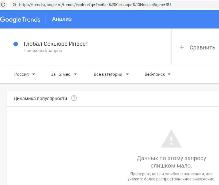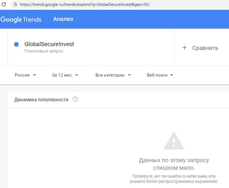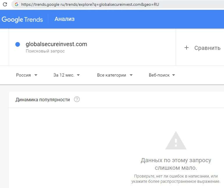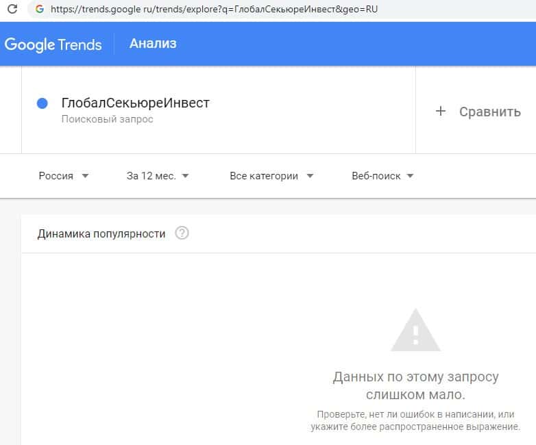 Поиск на ресурсе Google названия брендового имени на русском языке с двумя пробелами "Глобал Секьюре Инвест" предоставил следующий результат: слишком мало запросов.