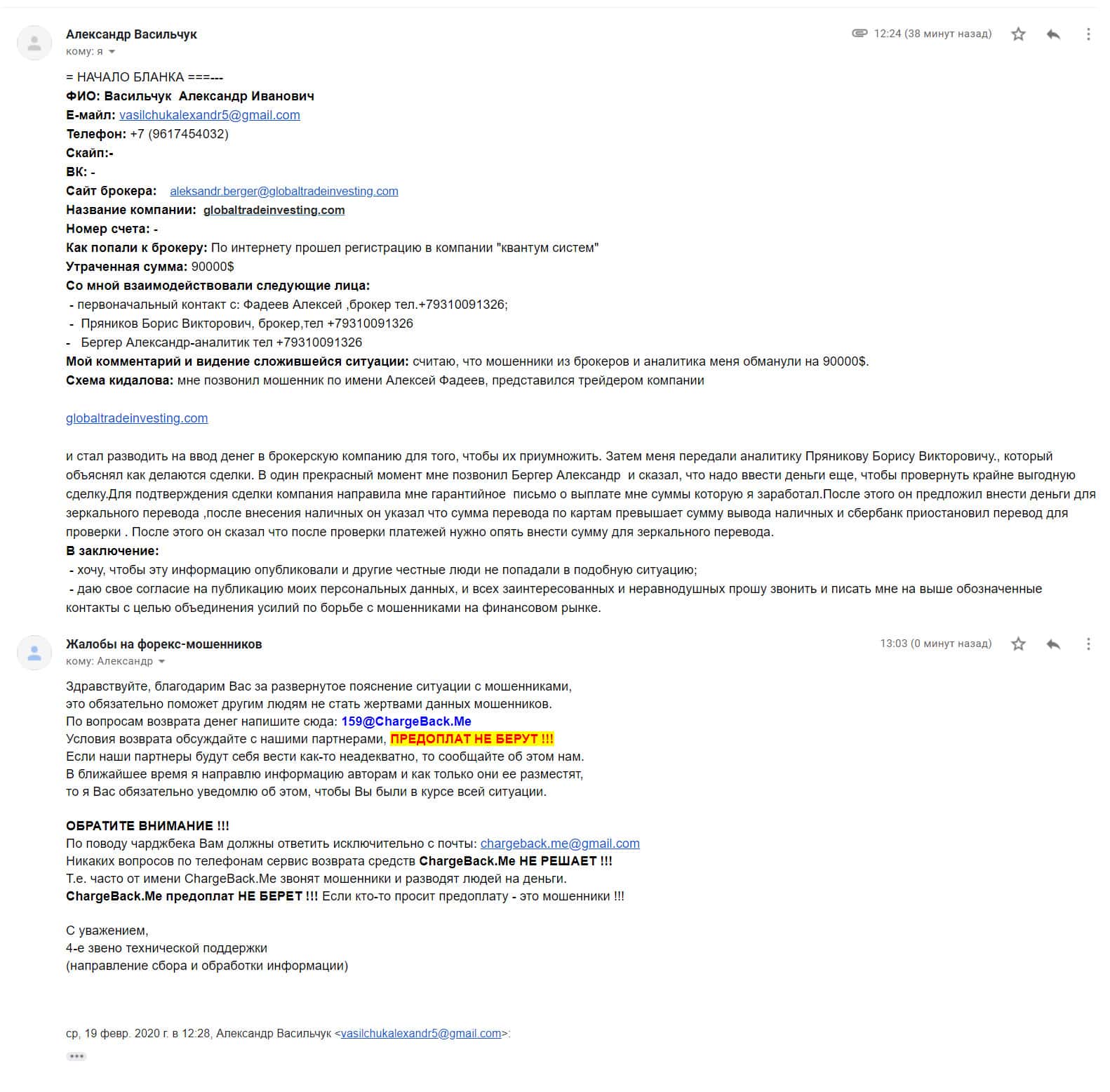 Далее представлена жалоба от человека, который попался на удочку к мошенникам Глобал Трейд Инвестинг, через подставную аферу Квантум Систем. Мошенники выманили у него около 90 000 долларов и теперь не понимает как правильно их можно вернуть. Вместо того, чтобы возвращать деньги, жулье просит совершить повторное вложение.