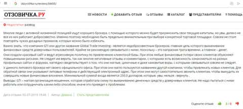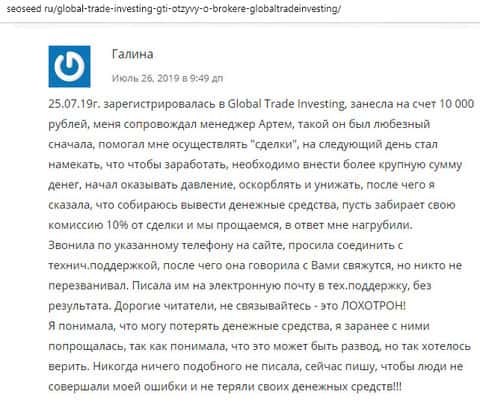 На публикации ниже можно ознакомится с очередной жалобой на мошенническую компанию Глобал Трейд Инвестинг, которая кроме как кинуть на деньги ничего пользователю всемирной паутины не принесет, ведь данная организация является еще одним форекс-лохотроном.