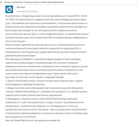 Еще один человек оставил отзыв, в котором описал все данные в юридическом плане, касательно вопроса о правомерности работы лохотрона GlobalTradeInvesting на территории Российской Федерации. Согласно с информационного письма Центробанка, контора Глобал Трейд Инвестинг находится вне закона.