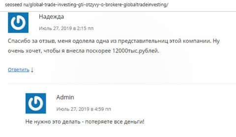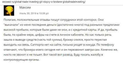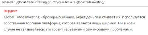 Лохотрон GlobalTradeInvesting попался в очередной обзор, только не за добрые дела. По словам веб-ресурса seoseed ru, контора Глобал Трейд Инвестинг - это брокер-мошенник, который выманивает деньги и сливает их. Они используют свою торговую платформу только для применения своих кухонных методах слива.
