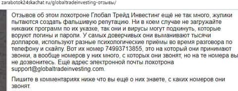 В данном обзоре от сайта zarabotok24skachat ru, нам удалось найти информацию о мошенниках GlobalTradeInvesting. В заключении сказано, что контора молодая и имеет не много негатива в интернете, но все же он есть. Это является предлогом к предупреждению остальных интернет-пользователей, которые еще не попались в эту шарагу.
