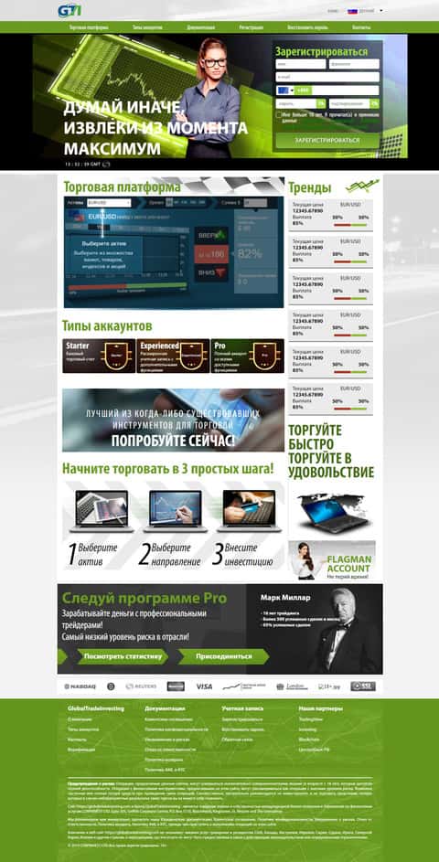 Так как Контора GlobalTradeInvesting это обычный лохотрон для торговли бинарными опционами, то и сайт они создали на соответственном уровне. Жулики используют различные фразы и формы с открытием счета, которые рассчитаны на обычных лохов, либо людей, которые вовсе не понимают куда попали.