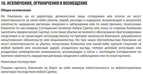 Брокерская контора Глобал Трейд Инвестинг продолжает повторять, что ни за что она отвечать не будет. Такие же слова и фразы нам удалось прочитать в договоре, который жулики предоставляют на подпись своим клиентам. Там сказано, что ни директора, ни должностные лица, ни сотрудники и агенты не несут ответственности перед клиентом.