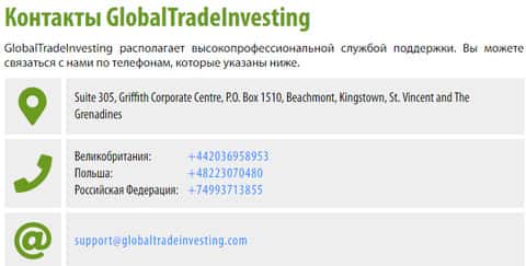 Бинарная контора Глобал Трейд Инвестинг предоставила контакты на своем сайте дабы как можно больше привлечь к себе внимания, а также доверия. После того как они вытянут у вас деньги, есть большая информация, что вас начнут игнорировать не только по основным контактам, но и по дополнительным. далее представим контакты жуликов: