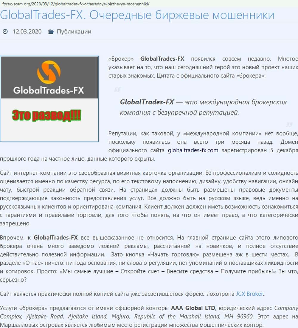Ворюги Глобал Трейдес ФХ пустили свои корни в оффшорной зоне на Маршалловых Островах, что характерно для форекс-мошенников, которые скрываются от закона.