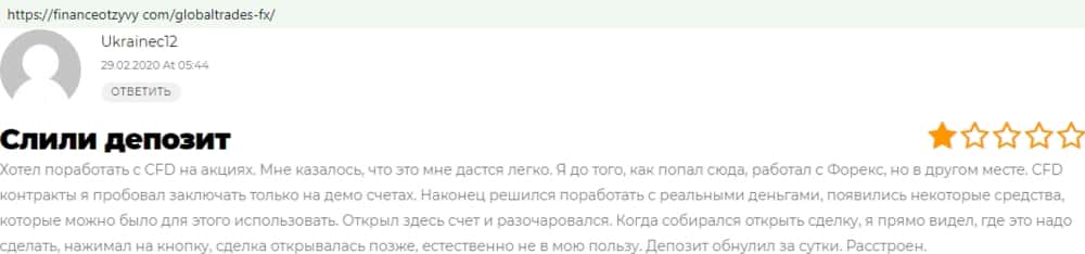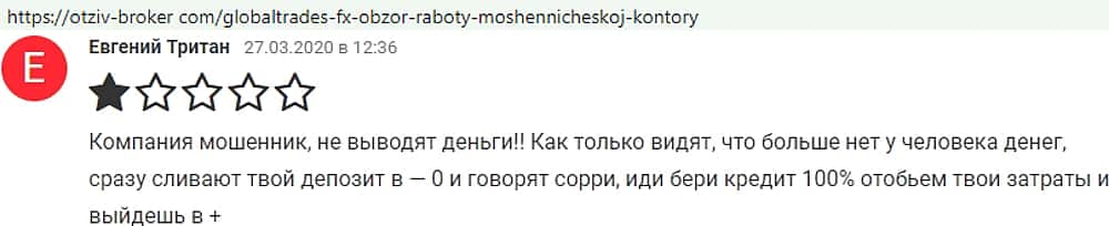 Подтверждает предыдущую историю еще один попавший в форекс-переплет GlobalTrades-FX трейдер. Он подтверждает, что при нулевом балансе кухонные плуты заявляют о кредите.