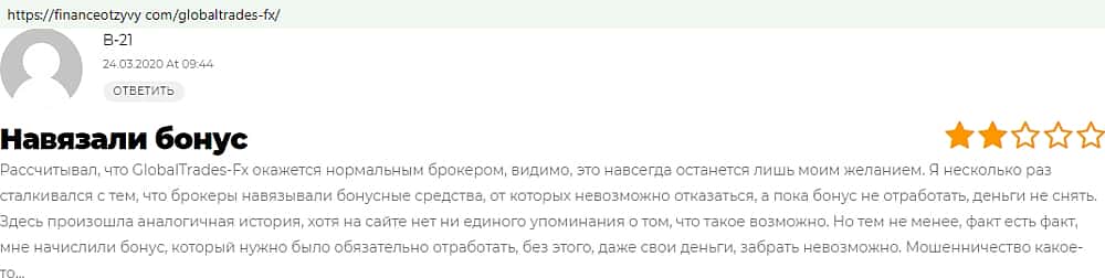 - Пользователям аферюги Глобал Трейдес ФХ навязывают бонусы, которые невозможно отработать