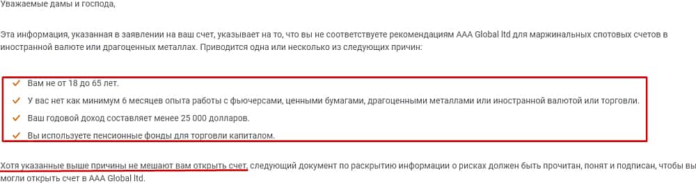 Сначала мошенники GlobalTrades-FX вроде бы утверждают, что имеют определенные соответствия для открытия счета, но в следующем же предложении отказываются от них.