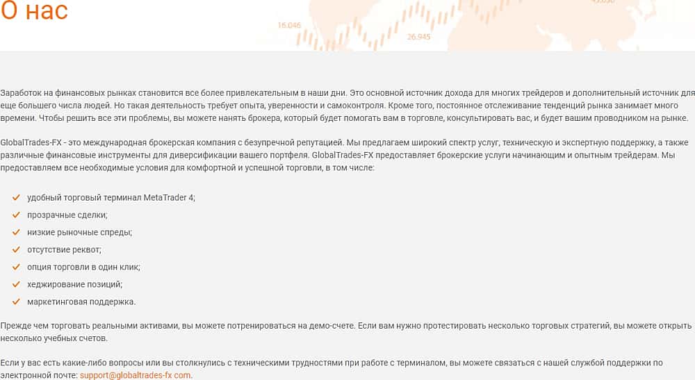 Свое руководство в разделе "О Нас" злодеи Глобал Трейдес ФХ не указали. Ограничились, как и все мошенники, некими обобщенными фразами и хвалебной саморекламой.