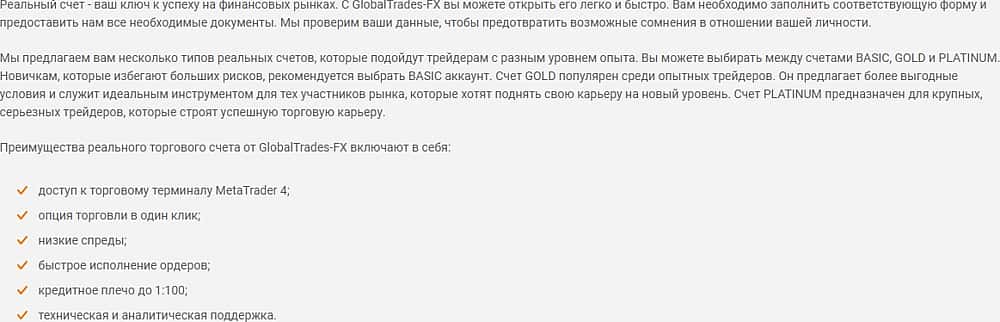 Наперсточники Глобал Трейдес ФХ предлагают три типа счетов для торговли: Basic, Gold и Platinum. В чем их различие, трейдер узнает только после регистрации, слив свои данные.