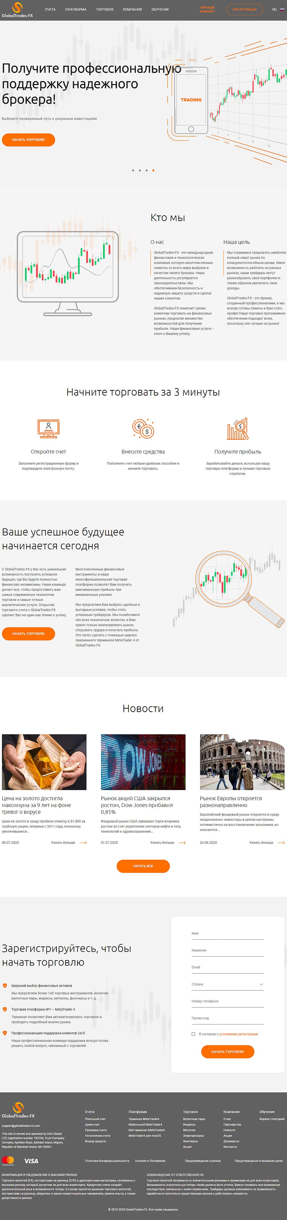 Сайт обманщиков Глобал Трейдес ФХ - дешевое шаблонное изделие, которое несет только рекламную чушь. Его главная цель - заарканить очередную доверчивую жертву.