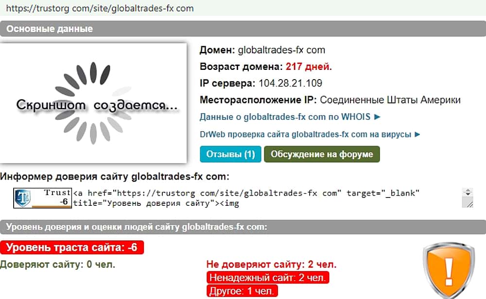 Липовый брокер Глобал Трейдес ФХ имеет очень низкий рейтинг доверия в сети Интернет. Об этом практически кричит онлайн-сервис для анализа благонадежности сайта.