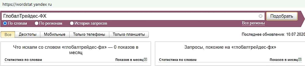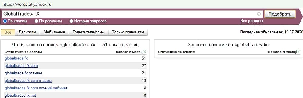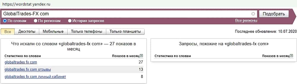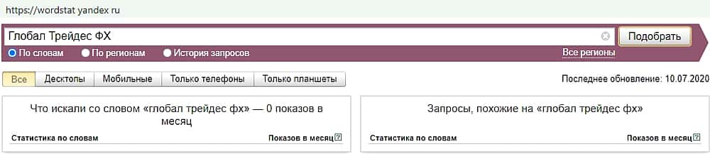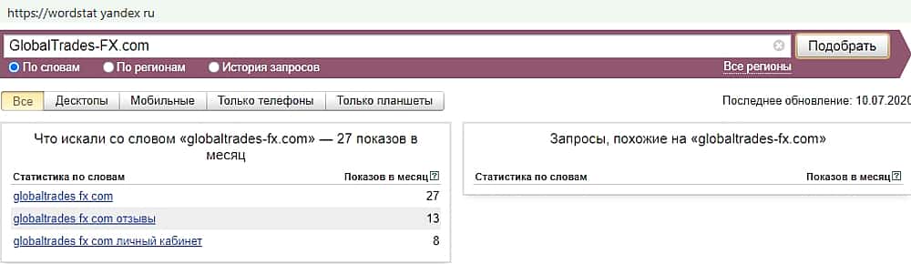 Русскоязычный вариант мошеннического бренда в поиске Яндекс оказался не популярен. За месяц ни разу никто не вводил для поиска запрос "Глобал Трейдес ФХ".
