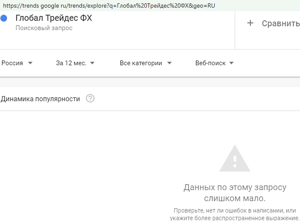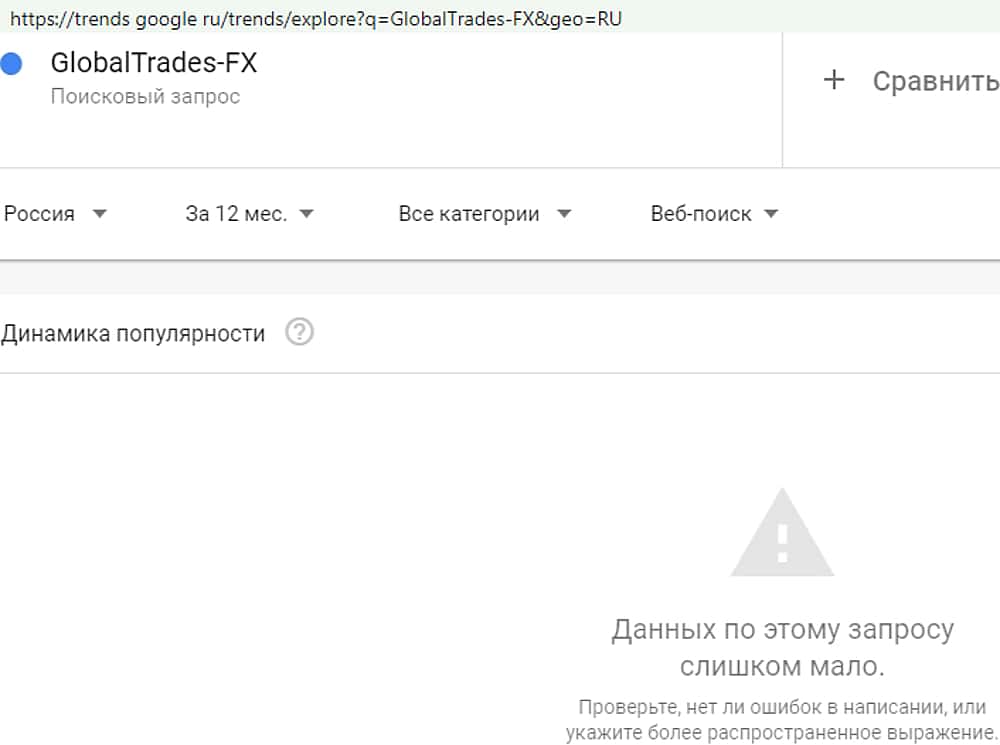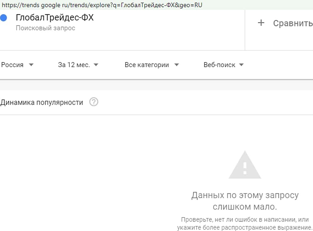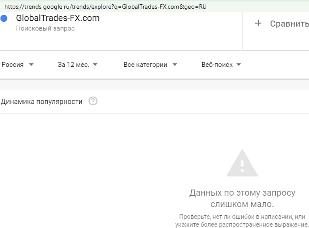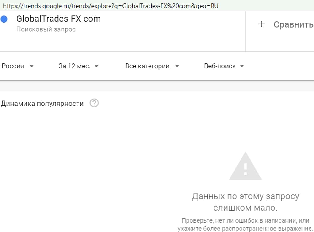 Как оказалось, даже само название внебиржевой лоховозки никого не интересует. Результат, показанный сервисом трендс гугл ком на запрос "GlobalTrades-FX" оказался нулевым.