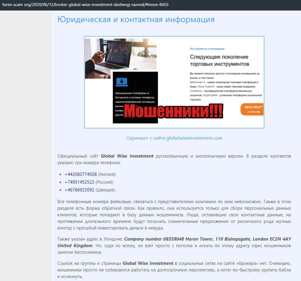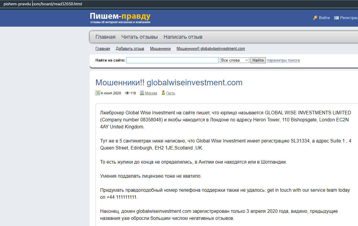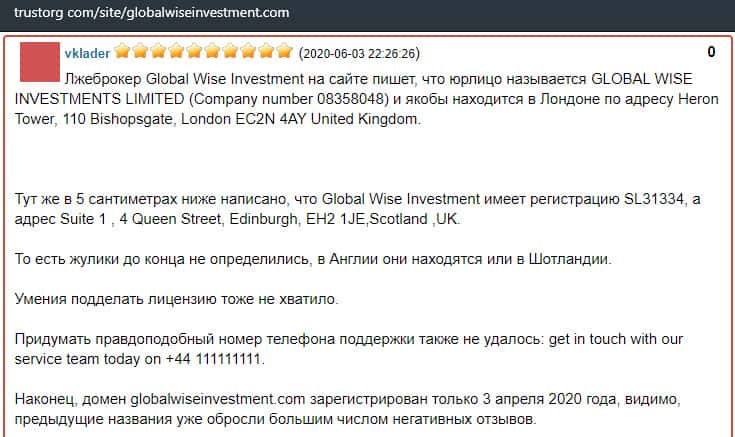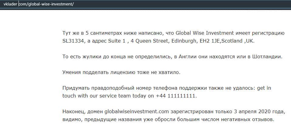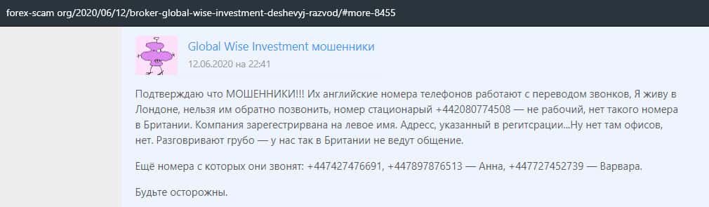 Далее представлен отзыв от человека, который подтверждает, что контора GlobalWiseInvestment является полнейшим мошенником. Он живет Лондоне и пробовал связаться с ними. По сути все их юридические данные это фейк, а также есть проблемы с номерами телефонов.