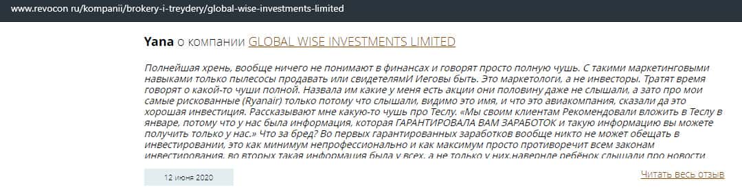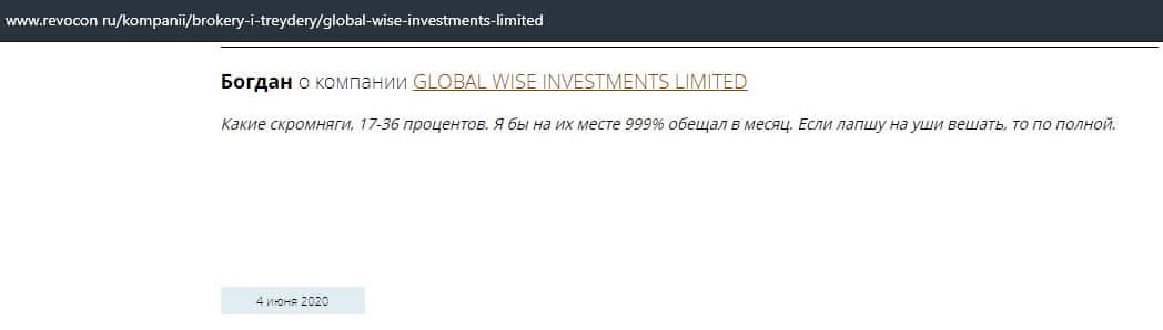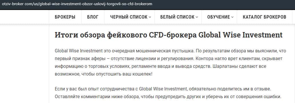 Как утверждает следующая статья, достаточно сложно понять, какой брокер перед вами, честный или нет. Поэтому следует отметить данное предложение от брокера GlobalWiseInvestment как предлог во всем разобраться. Ниже вы найдете информацию, которая точно убедит вас не вкладывать туда деньги.