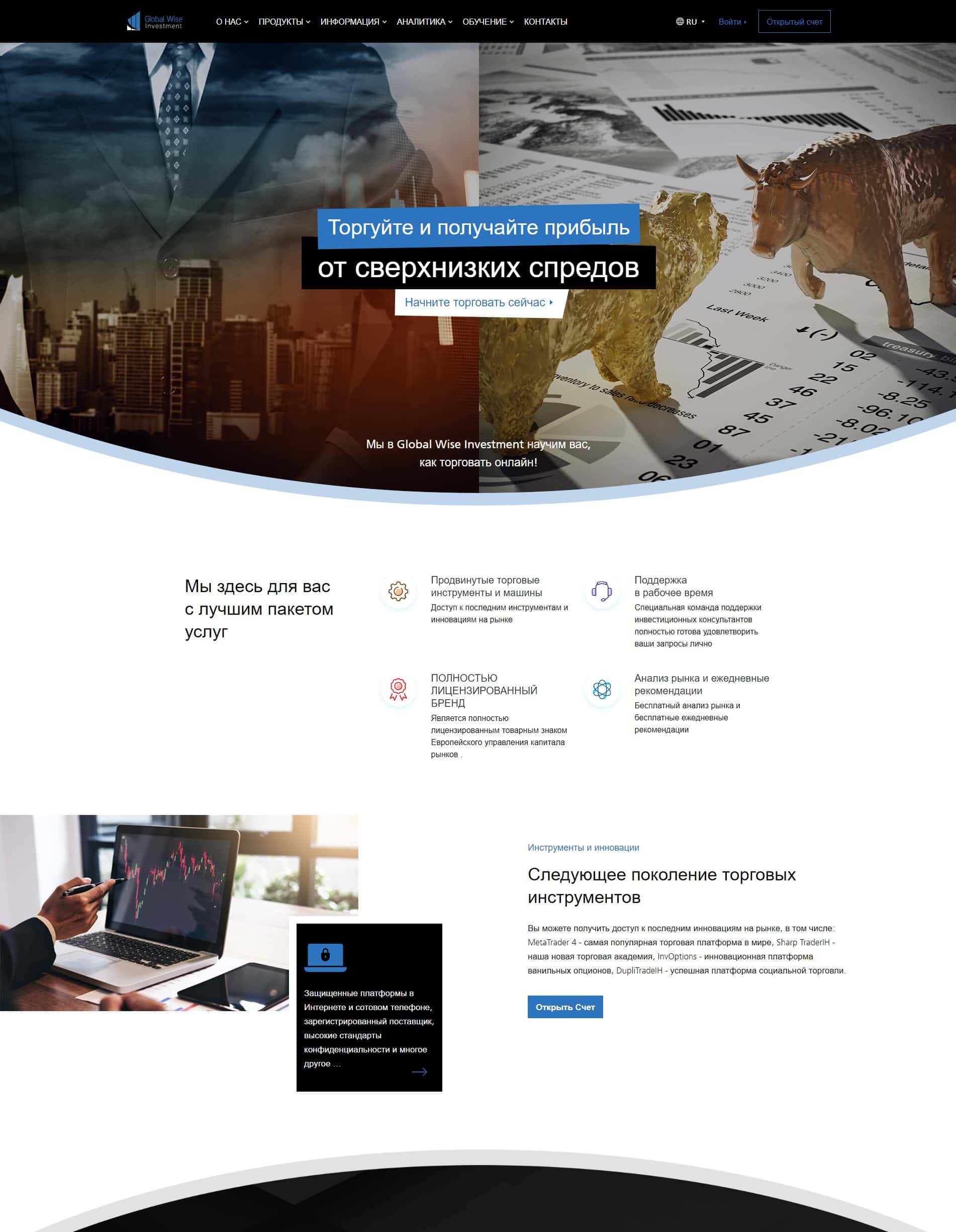 Брокерская контора GlobalWiseInvestment пытается показать себя в лучшем свете, но у нее мало что получается. Дело в том, что они предлагают продвинутые торговые инструменты и машины. Что за машины, нам тоже не понятно, поэтому это больше похоже на скопированный текст с какого-то сайта, либо кривой перевод, что подтверждает некомпетентность организаторов.