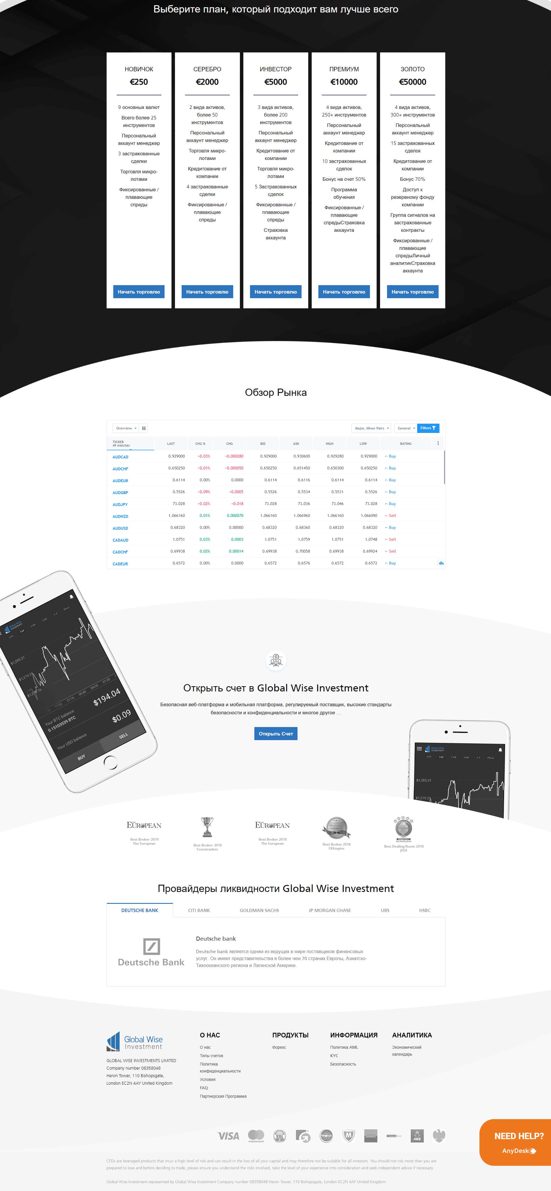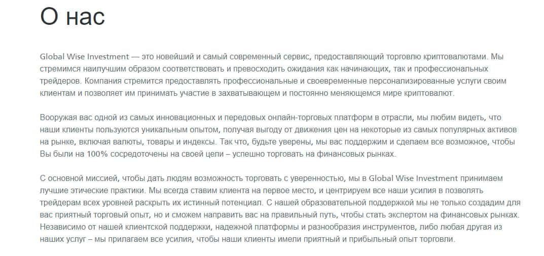Далее представлен официальный ресурс конторы GlobalWiseInvestment, где описывается вся информация о них и их деятельности. На сайте вывалено множество воды, которая так или иначе не имеет значения, а вот с конкретикой вообще возникают проблемы. Вы узнаете о реальных условиях только тогда, когда часть денег будет уже слита.