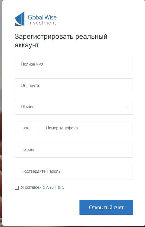 Чтобы открыть счет в конторе GlobalWiseInvestment, мошенники требуют у клиентов ввести свое полное имя, электронную почту, адрес проживания и номер телефона. Автор материала не доверял бы им, потому что сайту всего несколько месяцев, а соответственно нет гарантий, что ваши личные данные они не продадут.