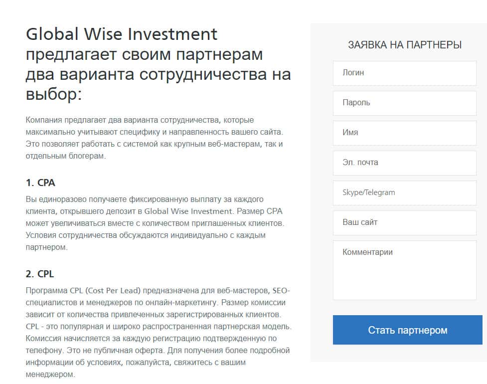 Чтобы стать таким предателем родины, следует пройти регистрацию, где нужно ввести логин и пароль, имя, электронную почту, скайп или телеграм, а также сайт, если есть. Также партнерство с конторкой GlobalWiseInvestment подразумевает два типа сотрудничество, а именно: получать единоразовую выплату за привлеченного лоха, либо получать вознаграждение за зарегистрированного пользователя.