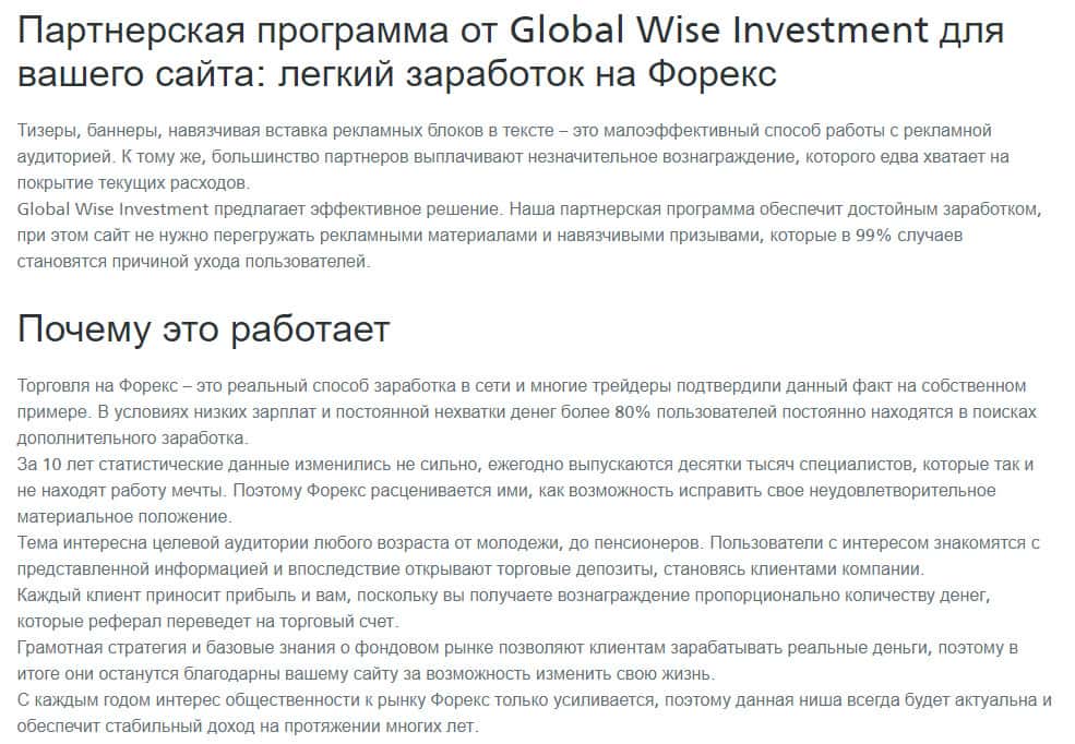 Брокерская контора GlobalWiseInvestment вместо того, чтобы рассказать об условиях торговли инструментами на рынке Форекс, начинает описывать общую тему, которую можно найти в любом источники в интернете. Люди должны понимать, что вестись на такого рода развод не стоит.