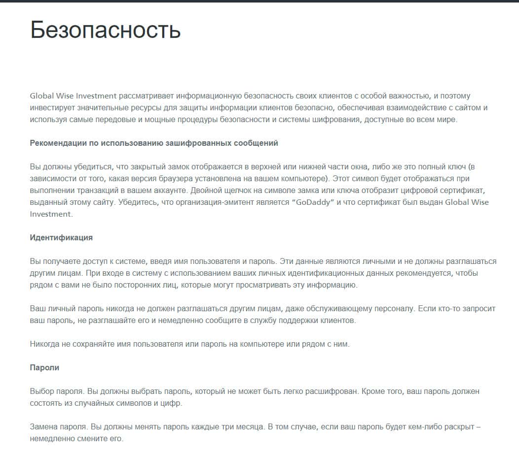 Как рассказывают нам на сайте конторы GlobalWiseInvestment, торговая платформа у них защищена и ни один хакер не сможет украсть ни ваши личные данные, ни деньги со счета. Но как показывает практика, данные ситуации случаются само часто и перед такими проблемами клиент попросту бессилен.