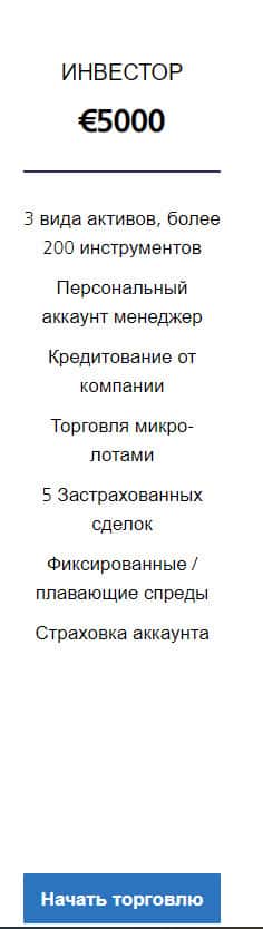 Есть также счет, который называется Инвестор. Вот здесь аферисты GlobalWiseInvestment предлагают открыть счет на 5000 евро, при чем выдают целый сервис используемых услуг. Нужно понимать, что это лишь приманка, так как в реальности большая половина всего предложенного не будет работать.