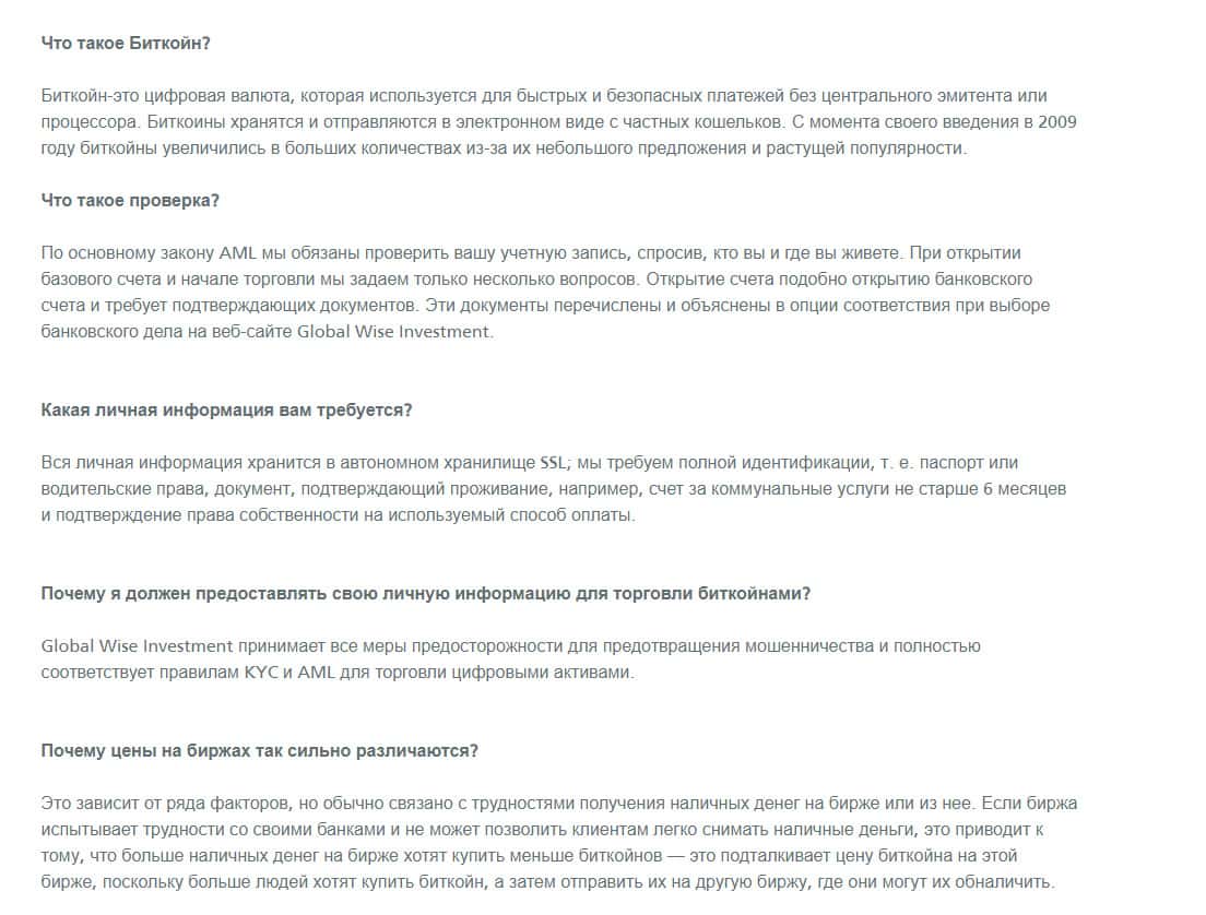На своем ресурсе, мошенники GlobalWiseInvestment опубликовали раздел в качестве глоссария, где рассказывается о самых примитивных моментах. Например это определение криптовалюты, либо отличие цен покупки и продажи. Все эти ответы на вопросы можно найти в открытых источниках.