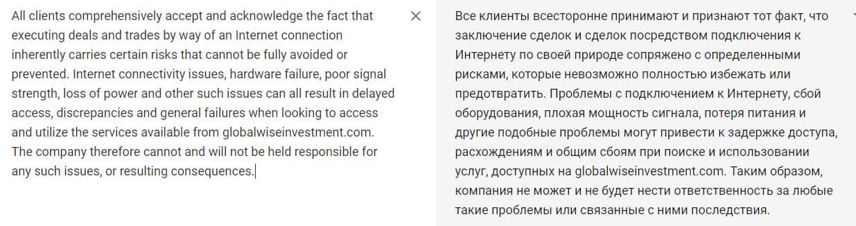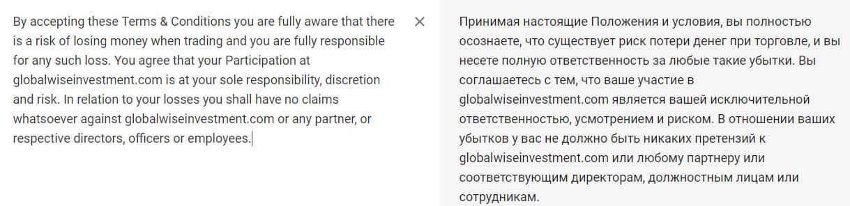 Чтобы полностью проверить как работает мошенническая контора GlobalWiseInvestment, следует обратиться в договор, который предоставлен на сайте лохотрона. Дело в том, что они указывают прямо в своем документе, что клиент полностью отвечает за средства, которые лежат у него на счете, даже если к пропаже причастна сама контора.