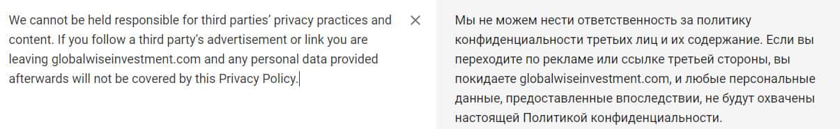 Политика конфиденциальности, которую предлагают в конторе GlobalWiseInvestment, довольно двусмысленная, так как они пишут о безопасности личных данных клиентов и в тоже время пишут, что имеют право на специальную обработку этой информации, а именно передачи ее третьим лицам.
