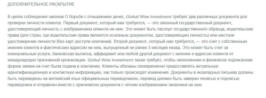 Отмывание денег - это один из любимых видов деятельности мошенников и некоторые брокерские организации как раз создаются под это дело. Как раз это и касается GlobalWiseInvestment, поэтому она и выставила на показ документ о политике Противодействия отмыванию средств в качестве прикрытия.