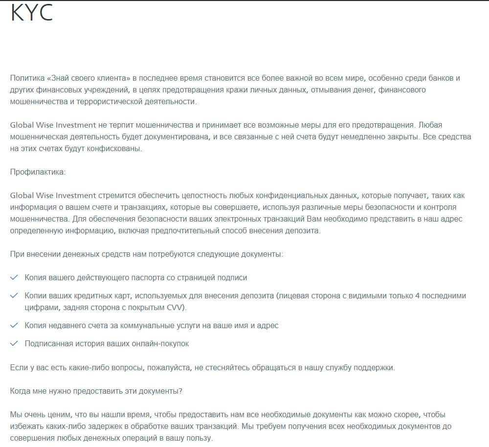 В следующей публикации описана в подробностях политика Знай своего клиента, которой якобы придерживаются мошенническая организация GlobalWiseInvestment. В последнее время становится это популярным делом, так как под этот шумок аферисты могут спокойно выманить у клиентов всю личную информацию о них.