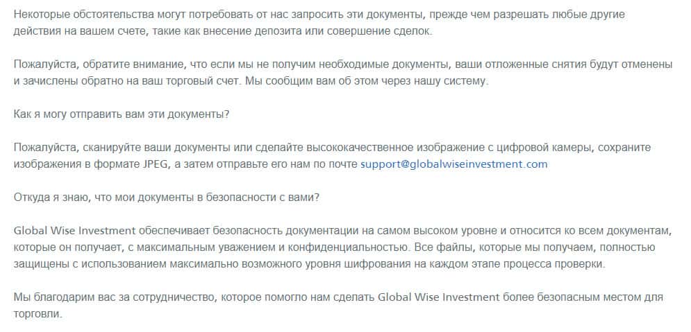 Вот в этом же документе мошенники GlobalWiseInvestment утверждают, что обстоятельства могут потребовать от них запросить документы, чтобы решать те или иные действия. Это могут быть как личные данные, так и полная информация о банковских счетах и картах. Тем не менее, лучше не передавать им ничего подобного.