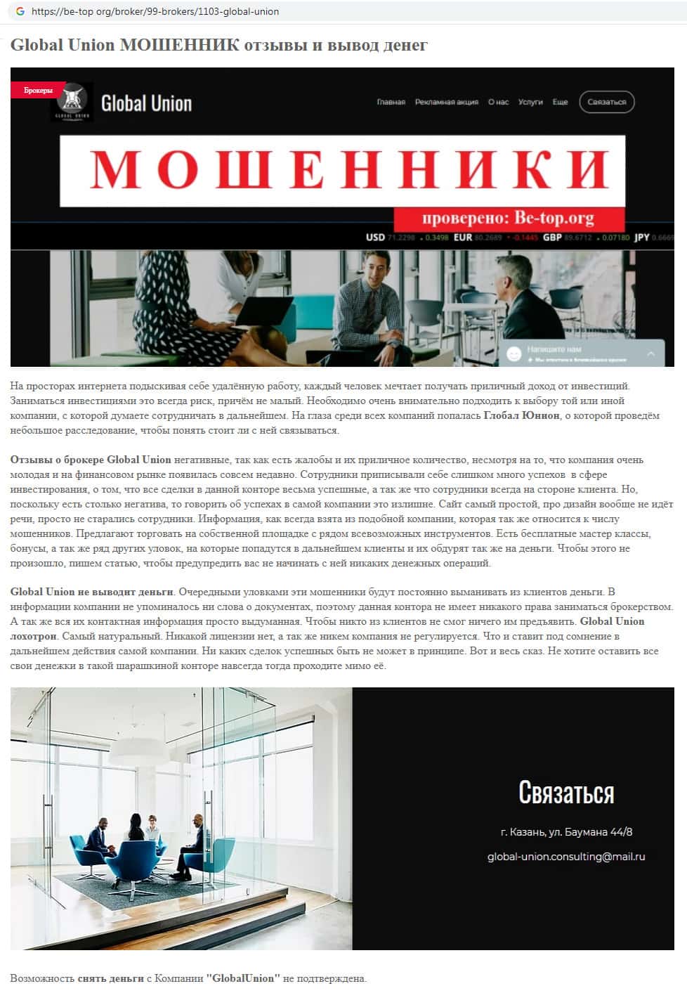 На веб-сервисе be-top org была отыскана статья-обзор шараги Global Union о том, что такое псевдо-бучение трейдингу не является гарантией возможности торговать без риска.