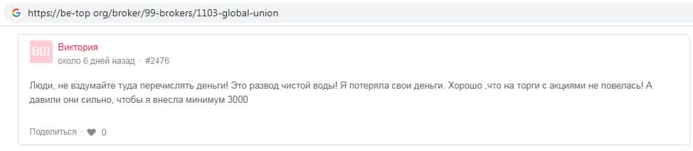 - Отзывы о фейковой конторе GlobalUnion Biz, ныне присутствующие в сети