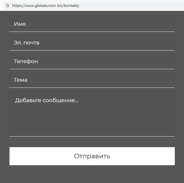 Жулики GlobalUnion Biz предлагают пользователям заполнить бланк обратной связи, где просят указать свое имя, адрес электронной почты и контактный номер телефона.