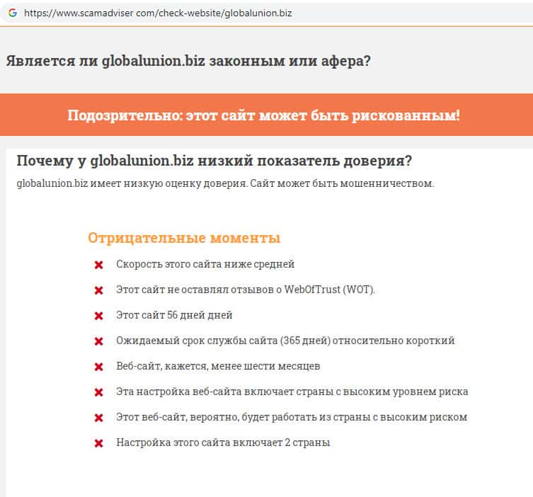 - Мошенническому сайту GlobalUnion Biz доверять нельзя