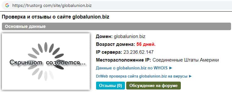 Проверка интернет-сервиса мошенников GlobalUnion Biz на trustorg com показала, что возраст домена к моменту написания статьи составляет всего лишь 56 дней.