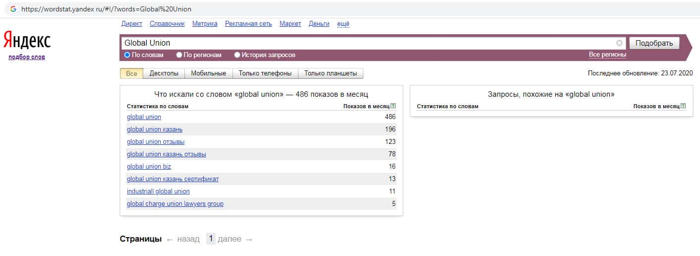 Количество запросов по бренду англоязычного названия компании с пробелом "Global Union" также вероятно равно 0.