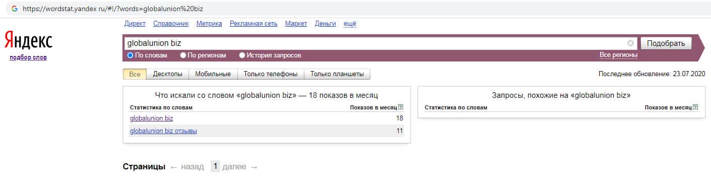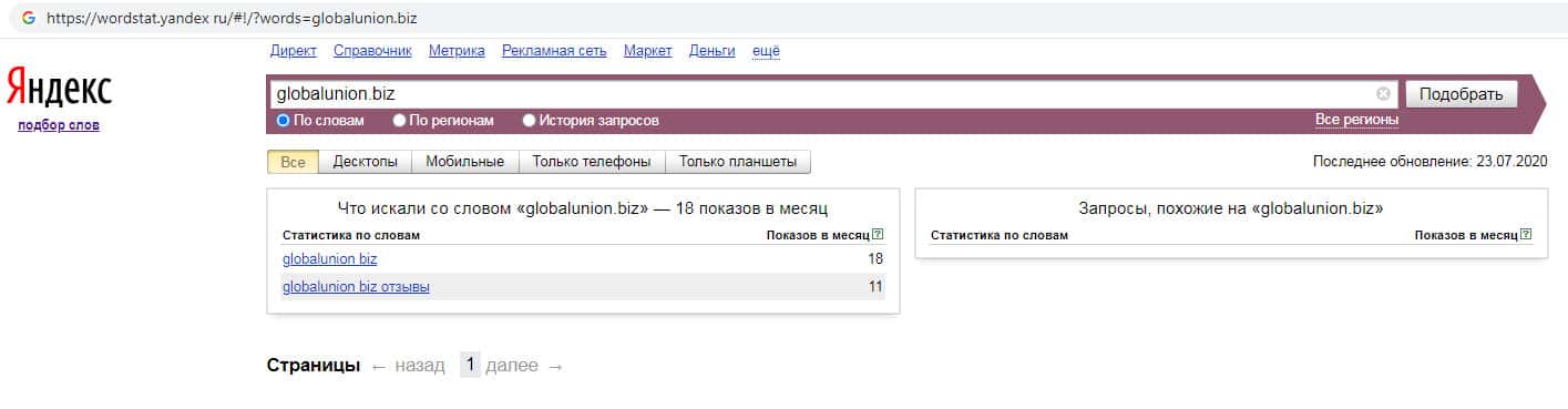О брендовых запросах названия домена без точки "globalunion biz" в поисковике Яндекс показатель такой же, 18 запросов за месяц.