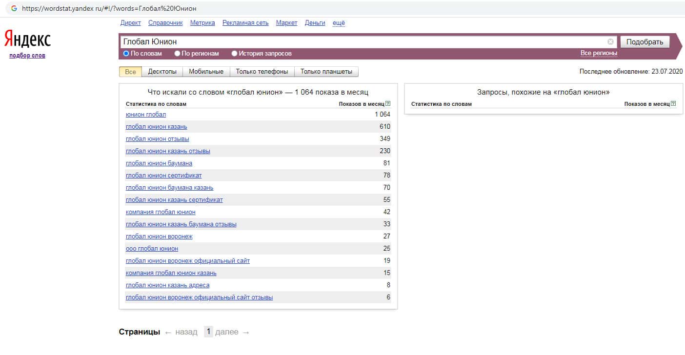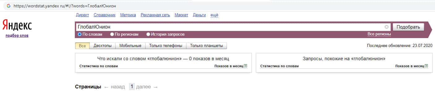 О запросах по бренду названия компании на русском языке без пробела "ГлобалЮнион" на Яндекс Вордстарт Ру нет результатов.