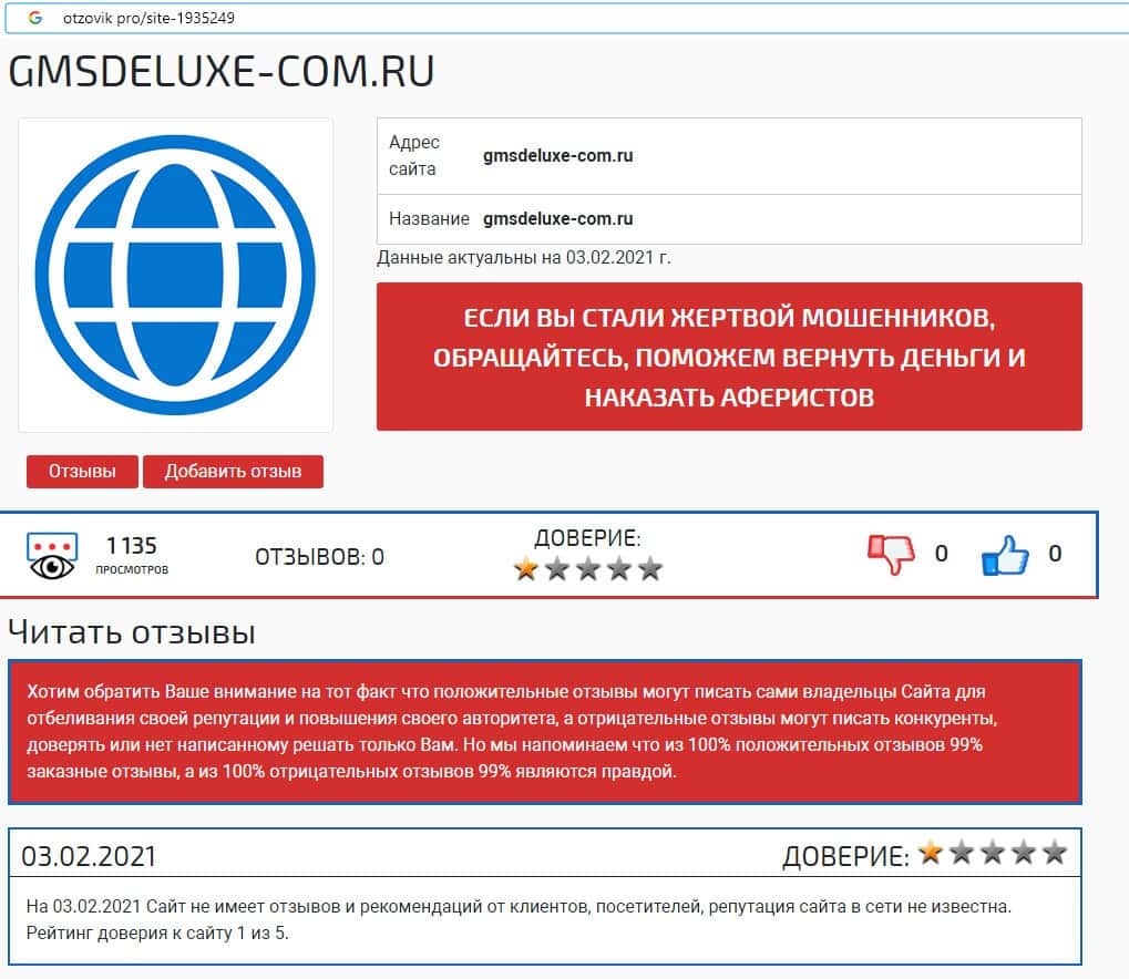 Автор данного отзыва пишет о том, что положительные отзывы о скам-организации GMS Deluxe во всемирной паутине проплаченные, верить мошенникам не имеет смысла.