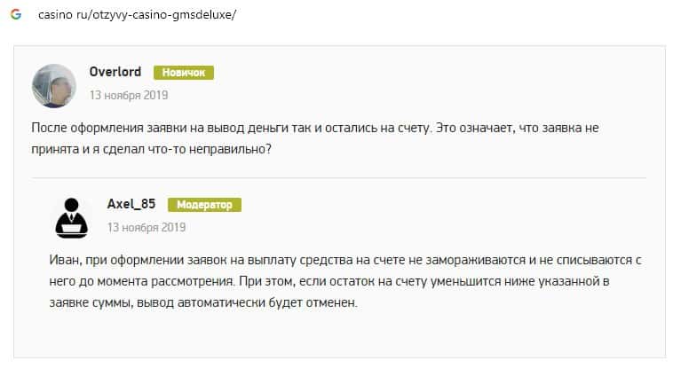 Следующий отзыв свидетельствует о том, что обманщики GMSDeluxe делают все возможное, чтобы у игрока не получилось вывести со счета ни копейки.