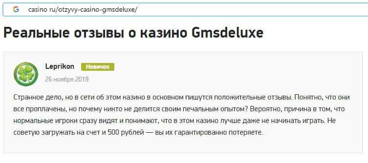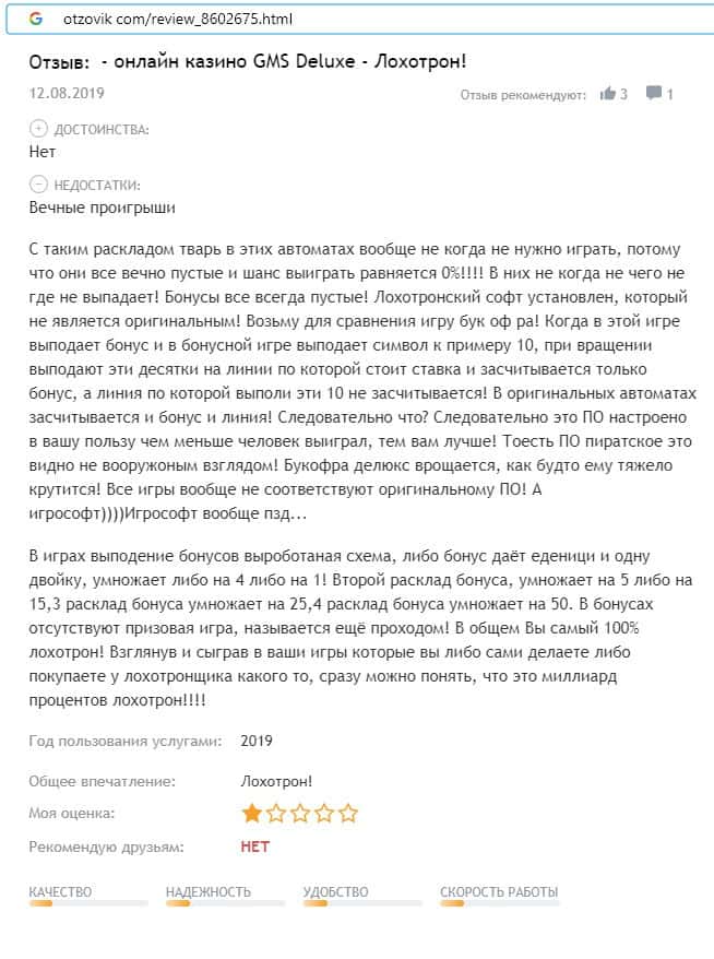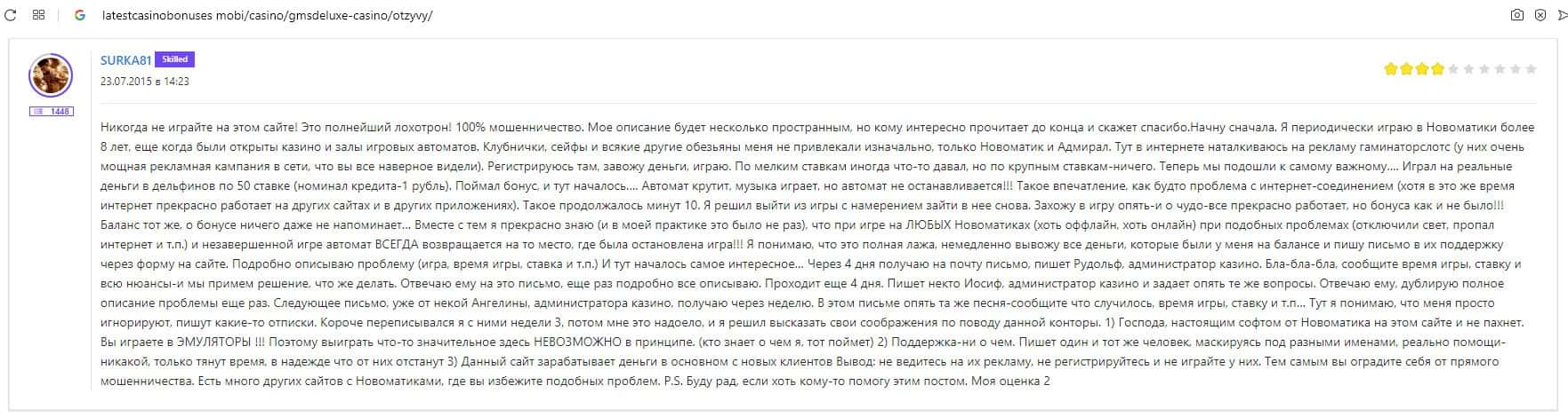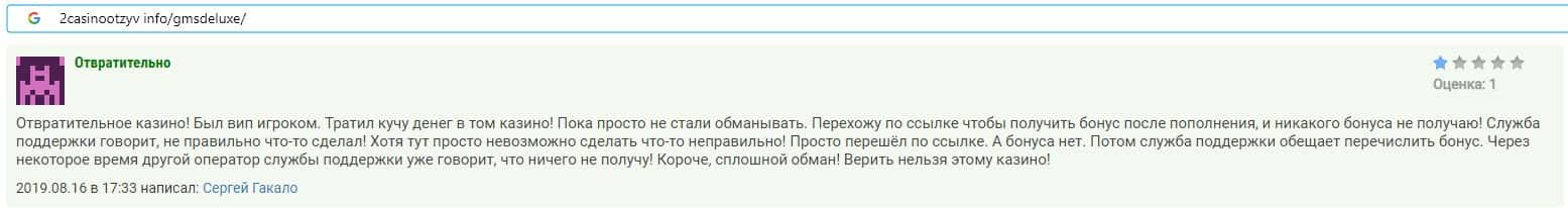 В данном разделе предлагаем ознакомиться с отзывами игроков о том, что перед нами банальный интернет-лохотрон ГМ Слотс Делюкс, на котором лучше не начинать играть.