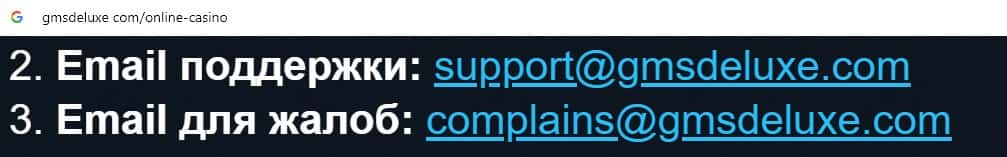 Афериты GMS Deluxe на своем официальном онлайн-ресурсе указывают два адреса электронной почты, а именно: