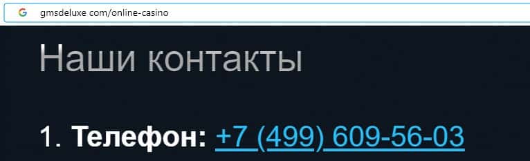 Обманщики ГМ Слотс Делюкс на своем дырявом сайте указали номер контактного телефона, с которого навязчиво названивают потенциальным жертвам: