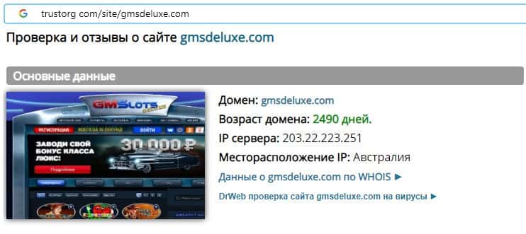 Проверка интернет-сервиса обманщиков ГМ Слотс Делюкс на trustorg com показала, что возраст домена к моменту написания статьи составляет 2490 дней, вероятно домен купленный.