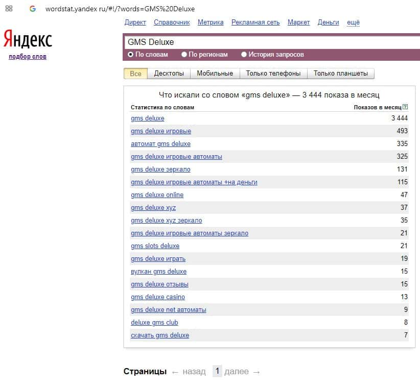 - Количество запросов по бренду ГМ Слотс Делюкс в поисковике Yandex